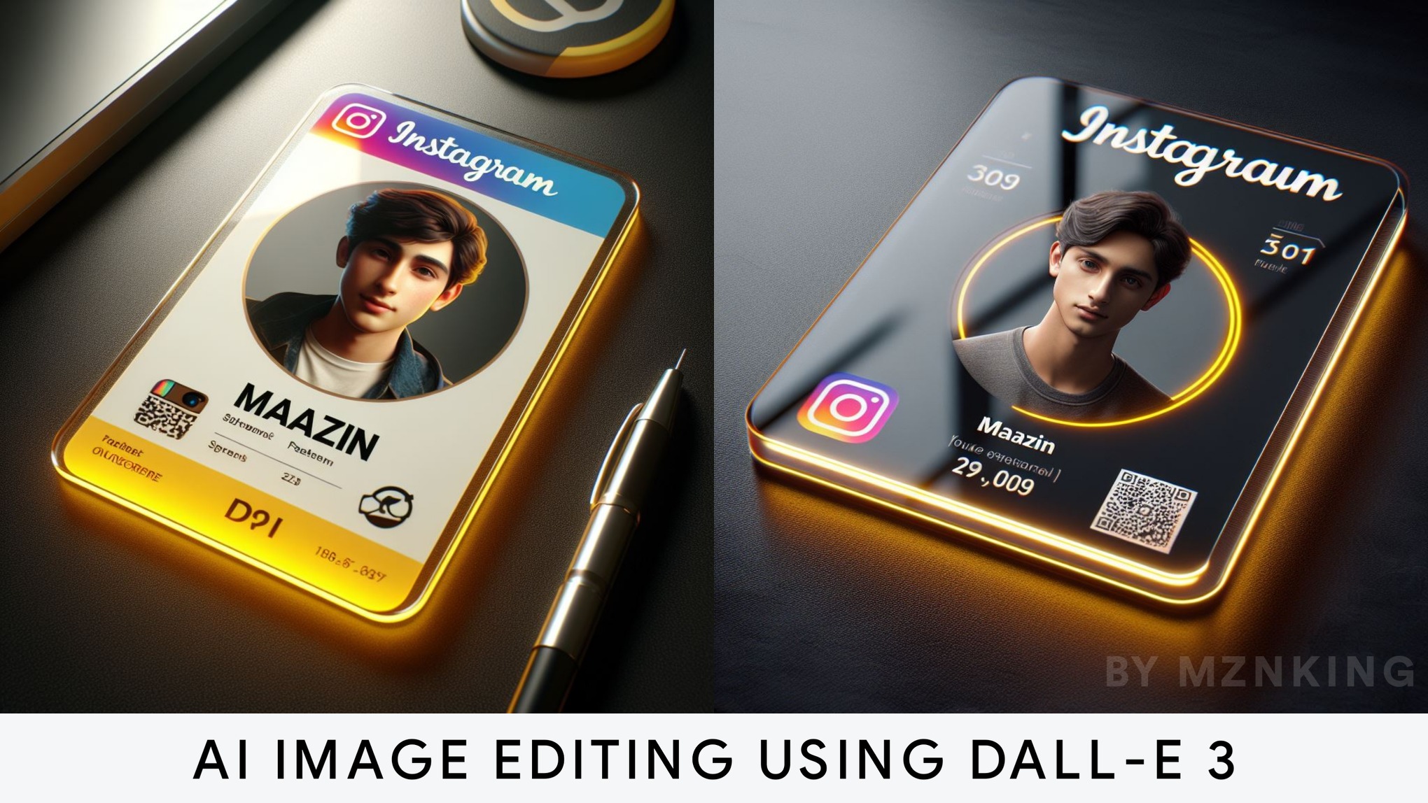 Create an Instagram profile on a glass ID card on a black desk displaying the Instagram logo and a realistic profile photo of a teenage boy in a circle. "Your Name" is written in bold fonts under the profile photo. The Instagram card is glowing in yellow color on the edge.
