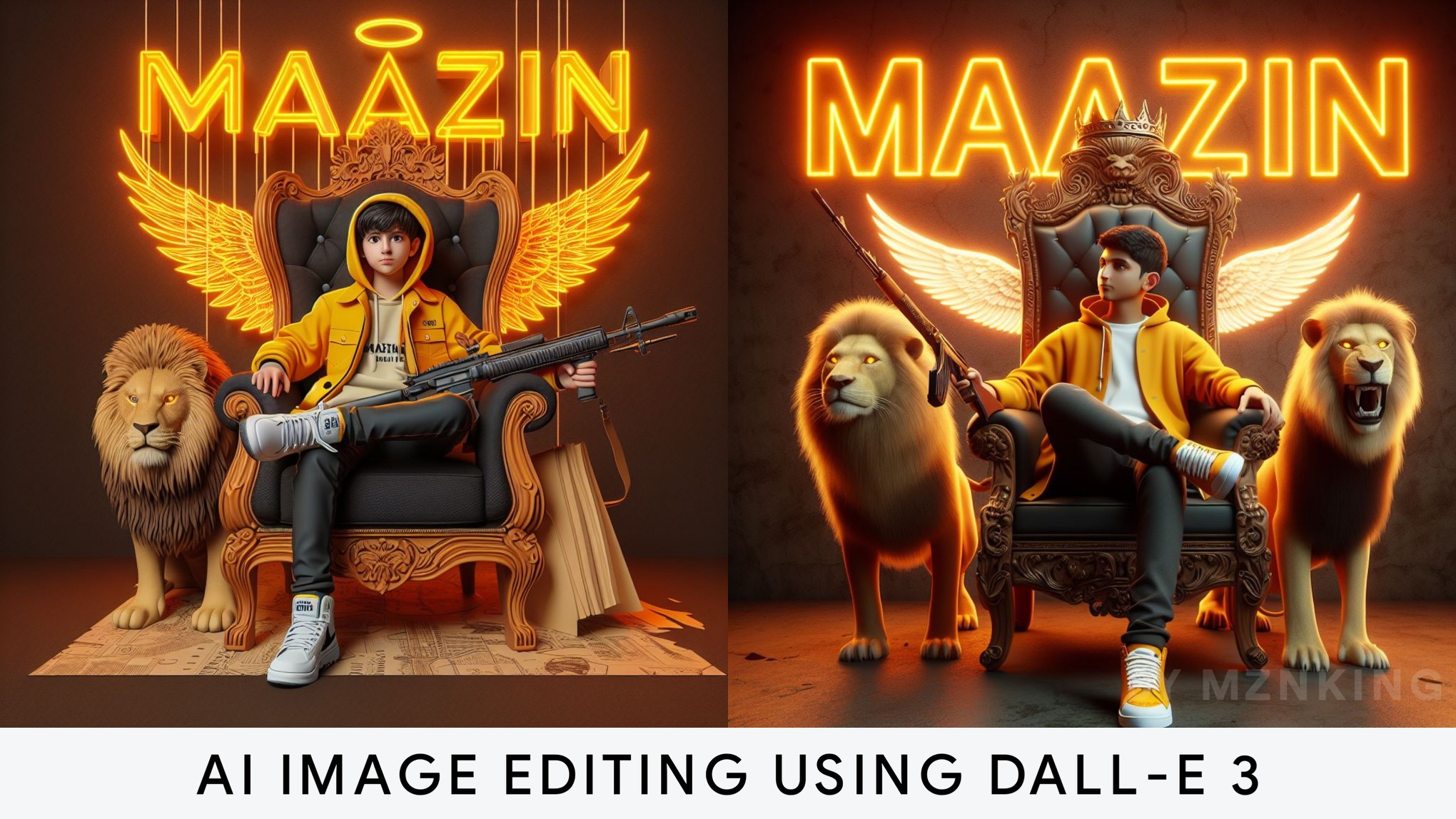 Create a 3D illusion for a profile picture where a cute 25 year old boy in a yellow jacket is sitting comfortably on a King of Beasts throne chair. With a rifle in his hand. And a ferocious lion beside me. Wearing sneakers, he looks ahead. "YOUR NAME" is written in large, orange neon light font on the dark brown wall in the background. He has no shadow and also has wings to make it look like he is an angel.