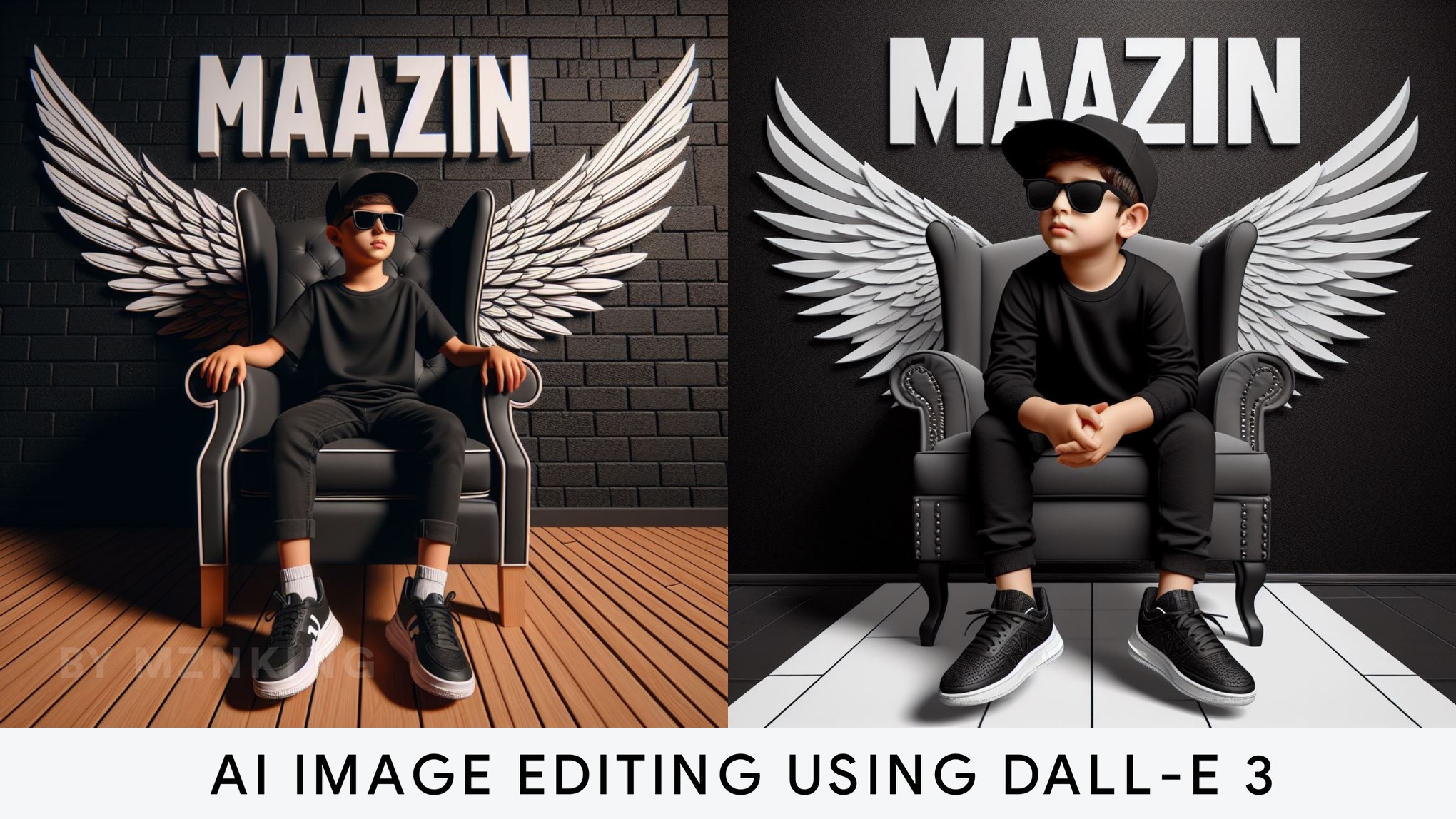 Create a 3D illusion for a Instagram profile picture where a boy in a black shirt sits casually on a Wingback Chair. Wearing sneakers ,a black cricket cap, and sunglasses, he looks ahead. The background features "Your Name" in big and capital white fonts on the black wall. There should not be his shadow, and there are wings to make it appear as if he is an angel.